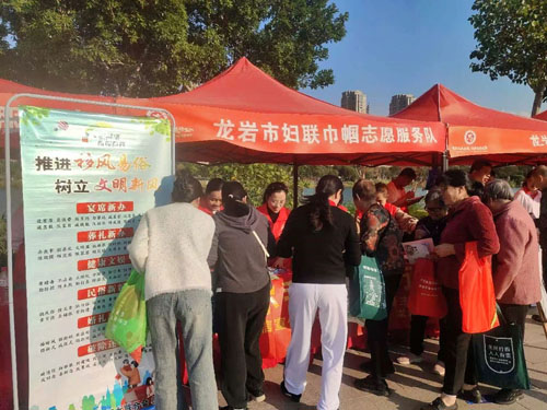 在志愿服务点,巾帼志愿者们向市民群众宣传普及宪法和男女平等基本国策,宣传反家庭暴力法、妇女权益保障法、家庭教育促进法以及移风易俗等知识,引导广大市民群众关心关爱妇女儿童,为推进“大爱龙岩”新时代精神文明品牌贡献巾帼力量。